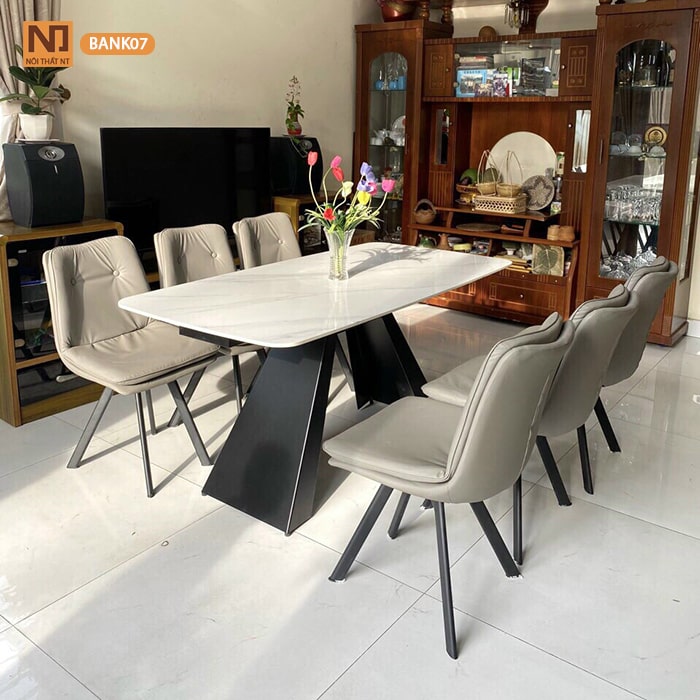 Hiện nay trên thị trường có rất nhiều mẫu mã bàn ghế ăn, để phù hợp với thị hiếu của người tiêu dùng chúng tôi đã luôn cố gắng phát triển các sản phẩm mới. Vì vậy nếu bạn đang tìm địa chỉ bán bàn ghế ăn đẹp tại Hà Nội, hãy ghé Đồ gỗ nội thất NT để xem và chọn cho mình mẫu bàn ghế ăn đẹp, chất lượng. Cùng nhìn qua mẫu bàn ăn nhập khẩu BANK07 nhé.
