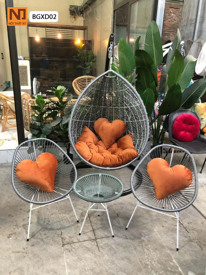 Bộ Ghế Ban Công BGXD02 gồm xích đu, ghế đơn và bàn. Bộ bàn ghế này được sử dụng ở ban công, sân vườn, quán cafe không gian rộng rãi. Sản phẩm không chỉ dùng để ngồi nhâm nhi ly cafe mà chúng còn là dấu riêng cho phong cách của ngôi nhà, tạo sự thu hút đối với mọi người.