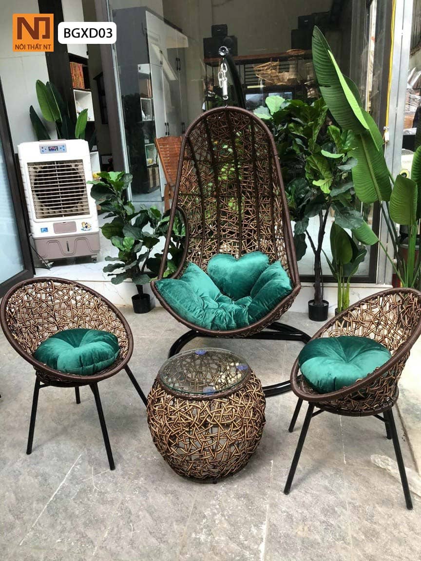 Bộ Ghế Ban Công BGXD03 gồm xích đu, ghế đơn và bàn. Bộ bàn ghế này được sử dụng ở ban công, sân vườn, quán cafe không gian rộng rãi. Sản phẩm không chỉ dùng để ngồi nhâm nhi ly cafe mà chúng còn là dấu riêng cho phong cách của ngôi nhà, tạo sự thu hút đối với mọi người.