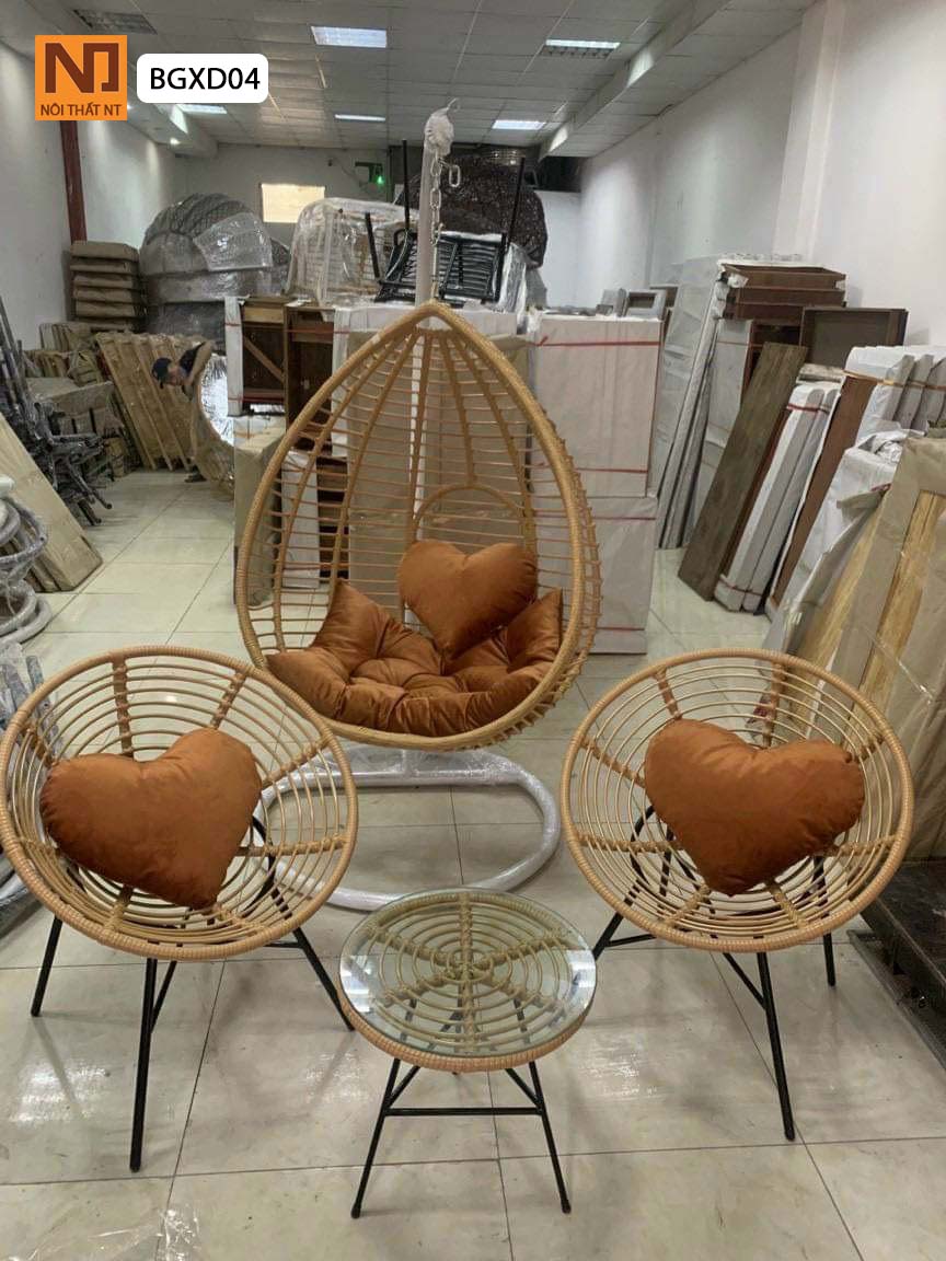 Bộ Ghế Ban Công BGXD04 gồm xích đu, ghế đơn và bàn. Bộ bàn ghế này được sử dụng ở ban công, sân vườn, quán cafe không gian rộng rãi. Sản phẩm không chỉ dùng để ngồi nhâm nhi ly cafe mà chúng còn là dấu riêng cho phong cách của ngôi nhà, tạo sự thu hút đối với mọi người.