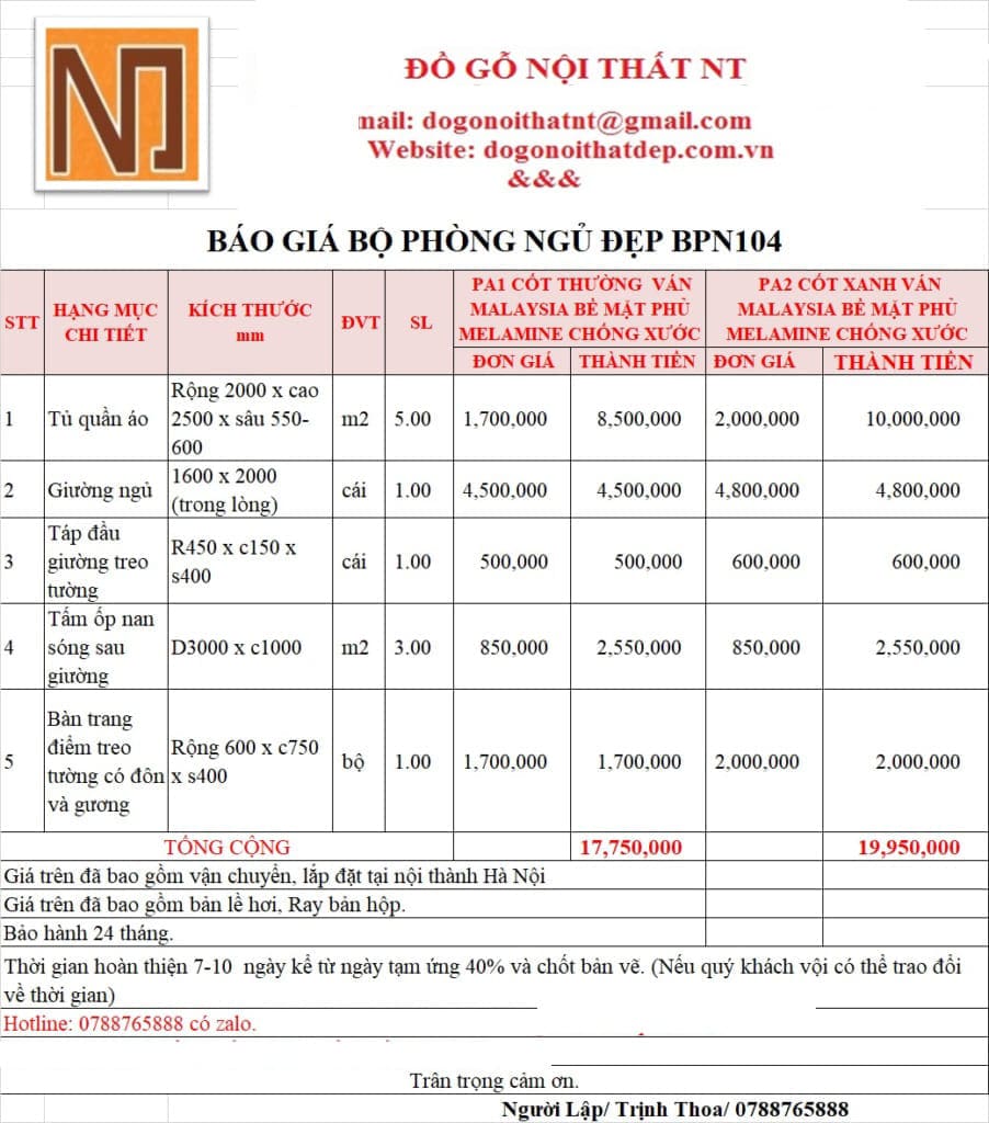 Báo giá bộ nội thất BPN104