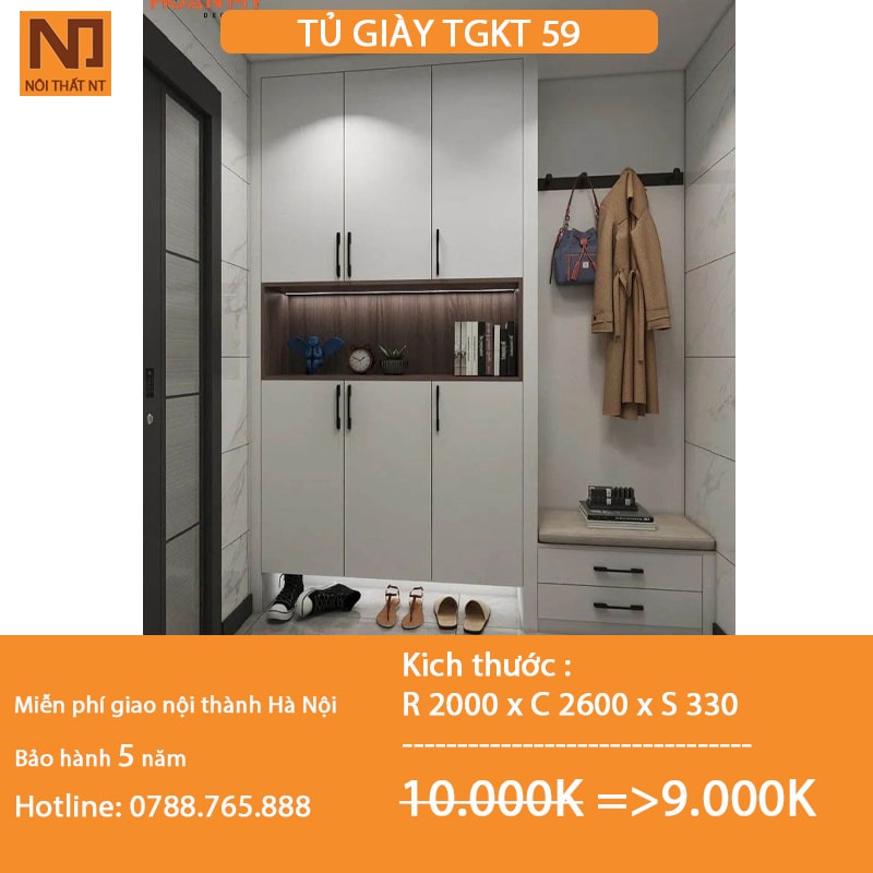 Tại Đồ gỗ nội thất NT chúng tôi chuyên cung cấp các mẫu tủ giày hiện đại, chất liệu gỗ công nghiệp MDF bề mặt phủ melamine cứng chắc, mẫu mã hiện đại, có nhiều kích thước khác nhau để lựa chọn. Bên cạnh đó chúng tôi cũng có nhận đặt đo đóng, thiết kế và thi công theo mẫu mã và kích thước yêu cầu. Sau đây mời bạn tham khảo qua mẫu tủ giày kích trần TGKT59 của Nội thất NT.