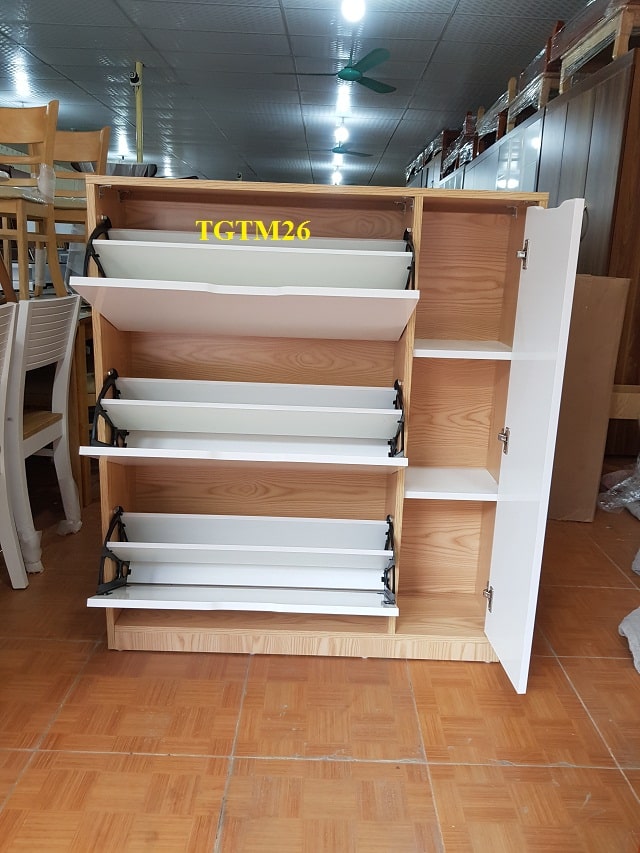 Tại Đồ gỗ nội thất NT chúng tôi chuyên cung cấp các mẫu tủ giày hiện đại, chất liệu gỗ công nghiệp MDF bề mặt phủ melamine cứng chắc, mẫu mã hiện đại, có nhiều kích thước khác nhau để lựa chọn. Bên cạnh đó chúng tôi cũng có nhận đặt đo đóng, thiết kế và thi công theo mẫu mã và kích thước yêu cầu. Sau đây mời bạn tham khảo qua mẫu tủ giày thông minh TGTM26 của Nội thất NT.