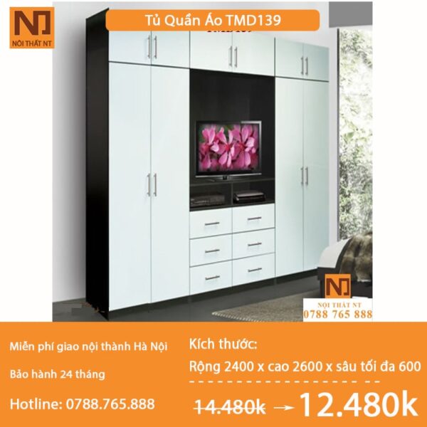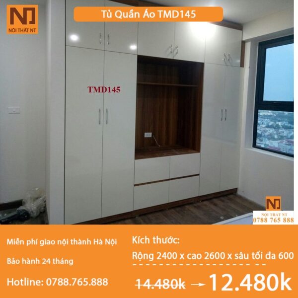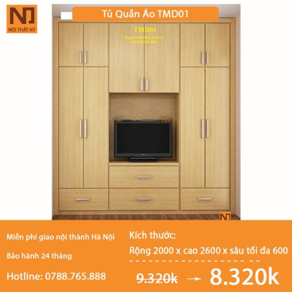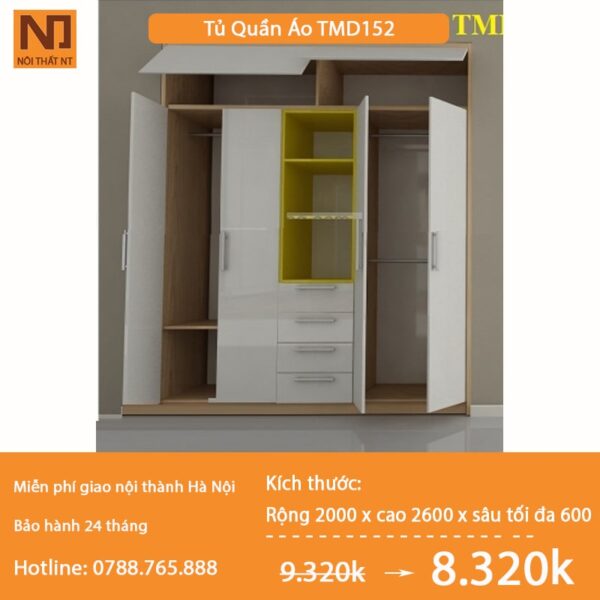 Tủ quần áo gần như là sản phẩm không thể thiếu đối với mỗi người. Nó giúp không gian sống của bạn gọn gàng hơn, là nơi cất giữ những bộ trang phục đẹp đẽ của bạn. Hiện nay trên thị trường có rất nhiều tủ quần áo mẫu mã, chất liệu khác nhau. Nếu bạn còn đang tìm kiếm địa chỉ sản xuất, thiết kế tủ quần áo nào ở Hà Nội uy tín thì hãy tham khảo các mẫu tủ quần áo đẹp gỗ công nghiệp của Đồ gỗ nội thất NT nhé, chúng tôi tin là bạn sẽ hài lòng. Cùng xem mẫu tủ quần áo hiện đại TMD301 nhé.