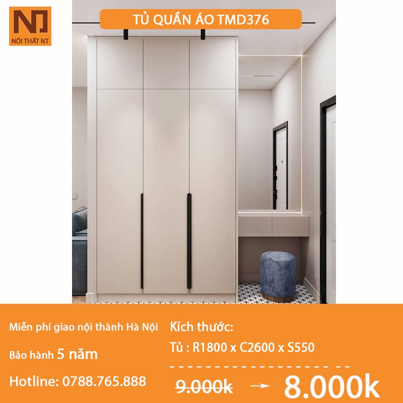 Tủ quần áo gần như là sản phẩm không thể thiếu đối với mỗi người. Nó giúp không gian sống của bạn gọn gàng hơn, là nơi cất giữ những bộ trang phục đẹp đẽ của bạn. Hiện nay trên thị trường có rất nhiều tủ quần áo mẫu mã, chất liệu khác nhau. Nếu bạn còn đang tìm kiếm địa chỉ sản xuất, thiết kế tủ quần áo nào ở Hà Nội uy tín thì hãy tham khảo các mẫu tủ quần áo đẹp gỗ công nghiệp của Đồ gỗ nội thất NT nhé, chúng tôi tin là bạn sẽ hài lòng. Cùng xem mẫu Tủ Quần Áo TMD376 nhé.