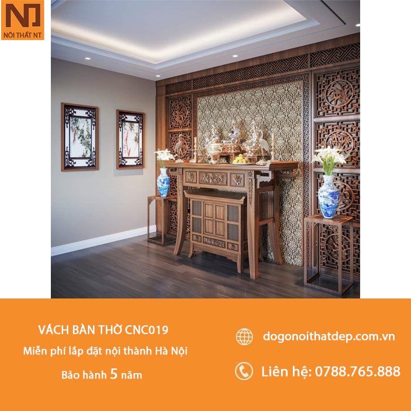 Vách cnc bàn thờ là sản phẩm luôn giữ vị trí trang trọng và thiêng liêng và là nơi thể hiện sự kính trọng và tưởng nhớ tổ tiên. Nếu bạn còn đang tìm kiếm địa chỉ sản xuất, thiết kế vách cnc nào ở Hà Nội uy tín thì hãy tham khảo các mẫu vách cnc bàn thờ của Đồ gỗ nội thất NT nhé, chúng tôi tin là bạn sẽ hài lòng. Cùng xem mẫu vách bàn thờ CNC019 nhé.