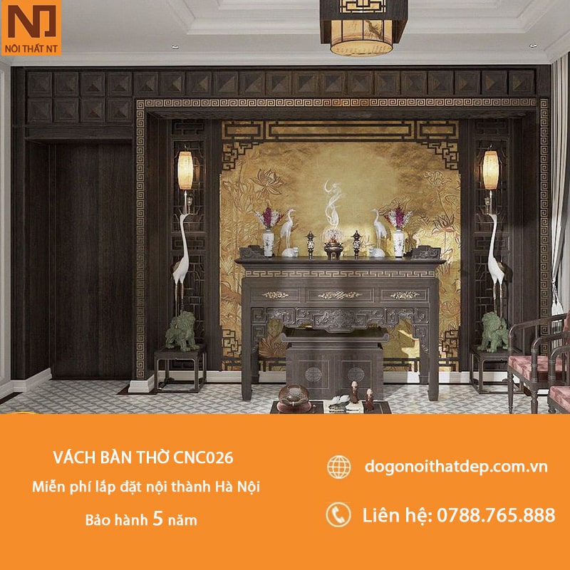 Vách cnc bàn thờ là sản phẩm luôn giữ vị trí trang trọng và thiêng liêng và là nơi thể hiện sự kính trọng và tưởng nhớ tổ tiên. Nếu bạn còn đang tìm kiếm địa chỉ sản xuất, thiết kế vách cnc nào ở Hà Nội uy tín thì hãy tham khảo các mẫu vách cnc bàn thờ của Đồ gỗ nội thất NT nhé, chúng tôi tin là bạn sẽ hài lòng. Cùng xem mẫu vách bàn thờ CNC026 nhé.