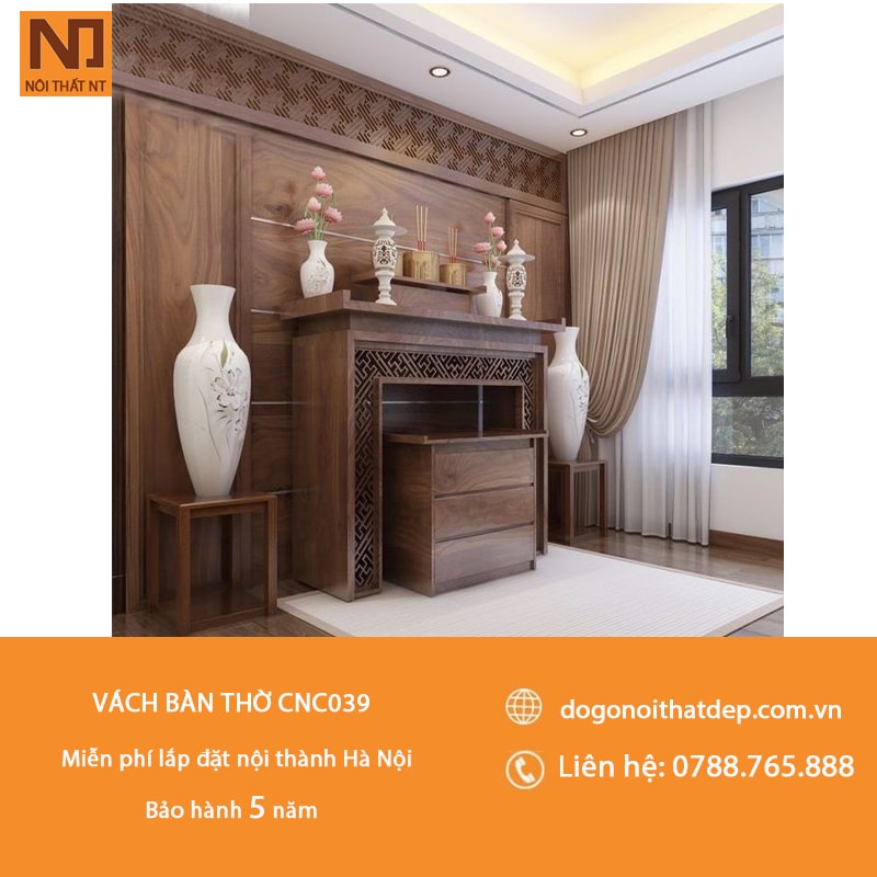 Bảo hành sản phẩm 5 năm trong điều kiện bình thường.Vận chuyển, lắp đặt miễn phí nội thành Hà Nội.Với kinh nghiệm nhiều năm trong nghề, chúng tôi tin rằng khi chọn mua vách cnc bàn thờ tại Đồ gỗ nội thất NT bạn sẽ hài lòng với sản phẩm do những người thợ chuyên nghiệp của chúng tôi tạo ra.