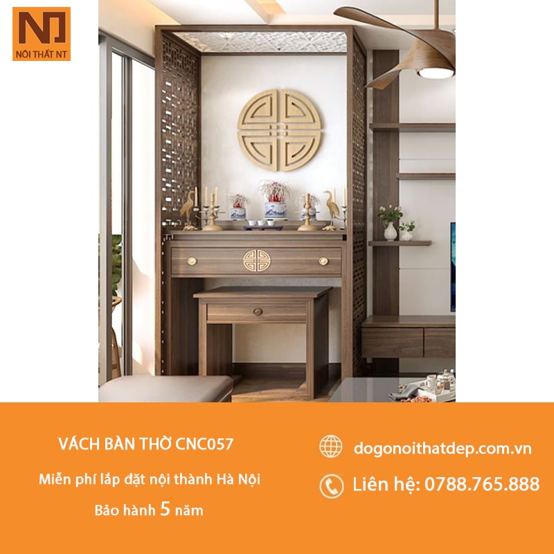 Vách cnc bàn thờ là sản phẩm luôn giữ vị trí trang trọng và thiêng liêng và là nơi thể hiện sự kính trọng và tưởng nhớ tổ tiên. Nếu bạn còn đang tìm kiếm địa chỉ sản xuất, thiết kế vách cnc nào ở Hà Nội uy tín thì hãy tham khảo các mẫu vách cnc bàn thờ của Đồ gỗ nội thất NT nhé, chúng tôi tin là bạn sẽ hài lòng. Cùng xem mẫu vách bàn thờ cnc057 nhé.