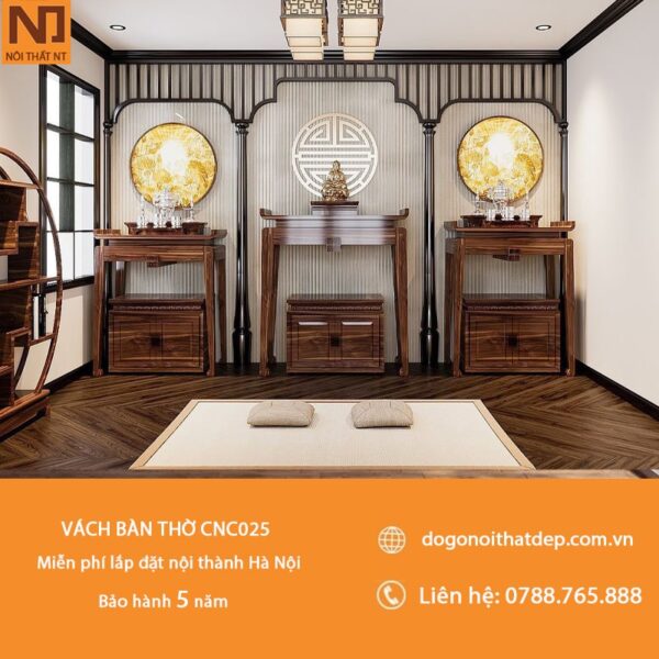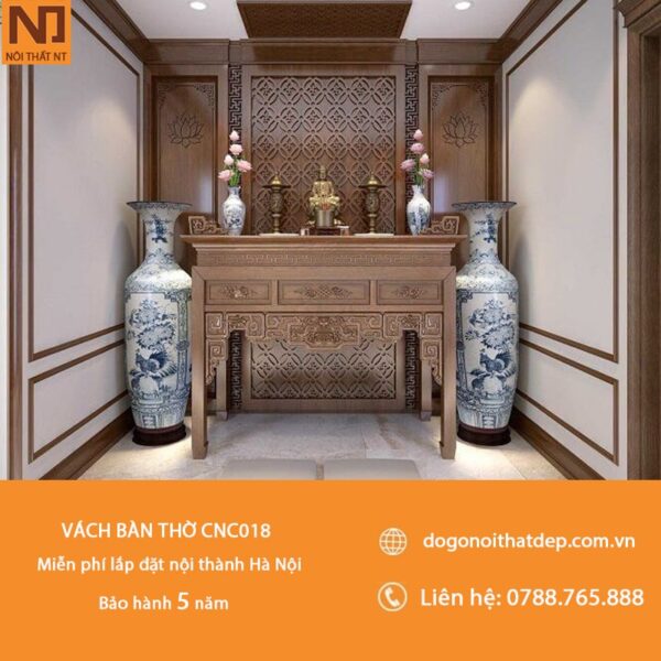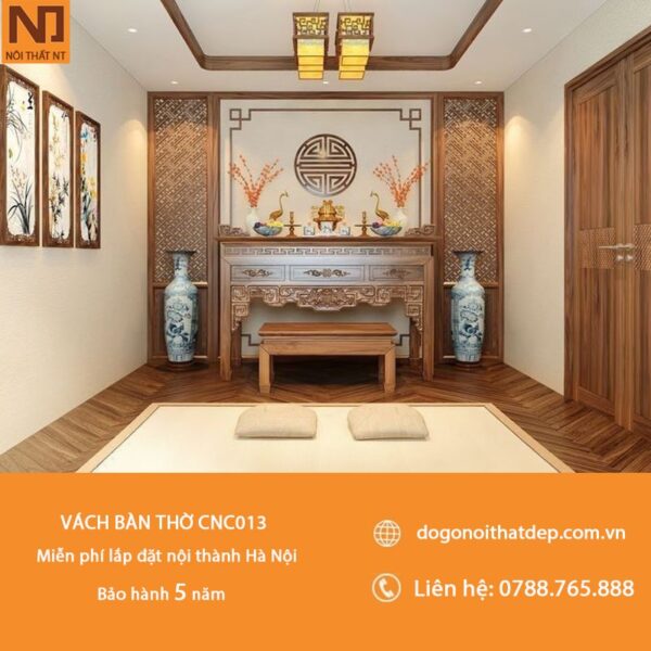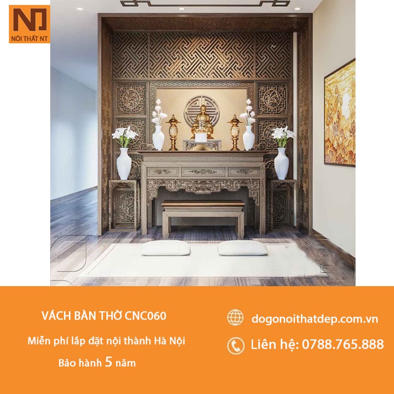 Vách cnc bàn thờ là sản phẩm luôn giữ vị trí trang trọng và thiêng liêng và là nơi thể hiện sự kính trọng và tưởng nhớ tổ tiên. Nếu bạn còn đang tìm kiếm địa chỉ sản xuất, thiết kế vách cnc nào ở Hà Nội uy tín thì hãy tham khảo các mẫu vách cnc bàn thờ của Đồ gỗ nội thất NT nhé, chúng tôi tin là bạn sẽ hài lòng. Cùng xem mẫu vách bàn thờ cnc060 nhé.