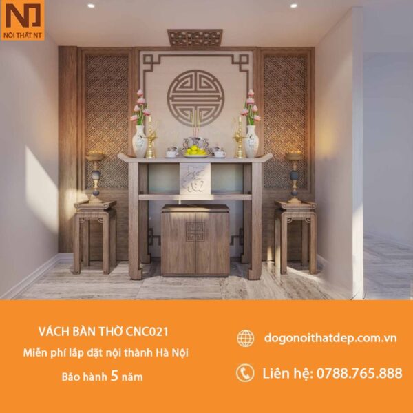 Bảo hành sản phẩm 5 năm trong điều kiện bình thường.Vận chuyển, lắp đặt miễn phí nội thành Hà Nội.Với kinh nghiệm nhiều năm trong nghề, chúng tôi tin rằng khi chọn mua vách cnc bàn thờ tại Đồ gỗ nội thất NT bạn sẽ hài lòng với sản phẩm do những người thợ chuyên nghiệp của chúng tôi tạo ra.