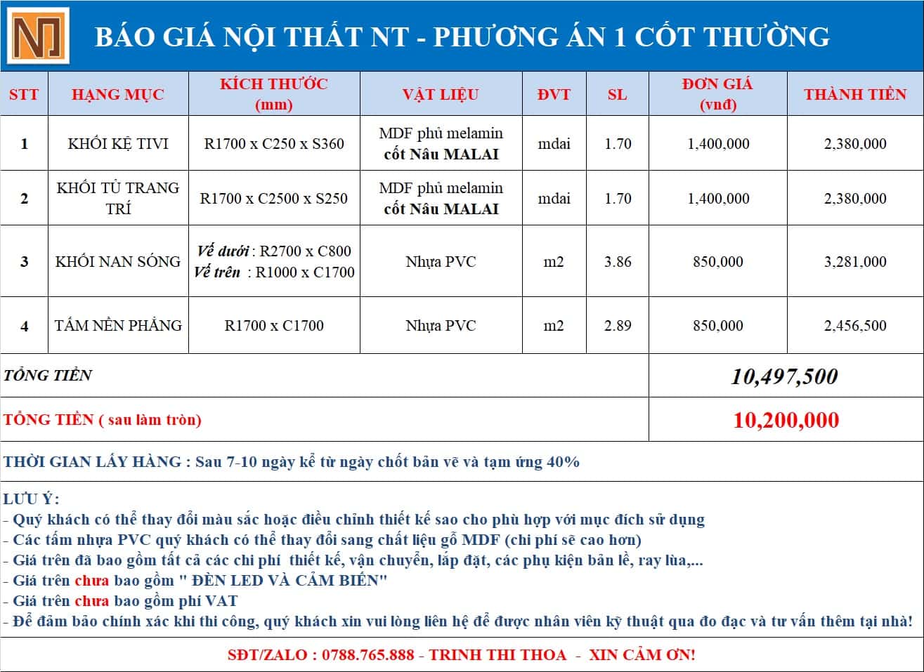 Sau khi thực hiện ốp vách kệ tivi xong, nhân viên Nội Thất NT tiến hành kiểm tra lại một lần nữa. Nếu không có sai xót gì, nhận thanh toán của khách hàng và tư vấn về chính sách bảo hành nếu khách hàng yêu cầu.