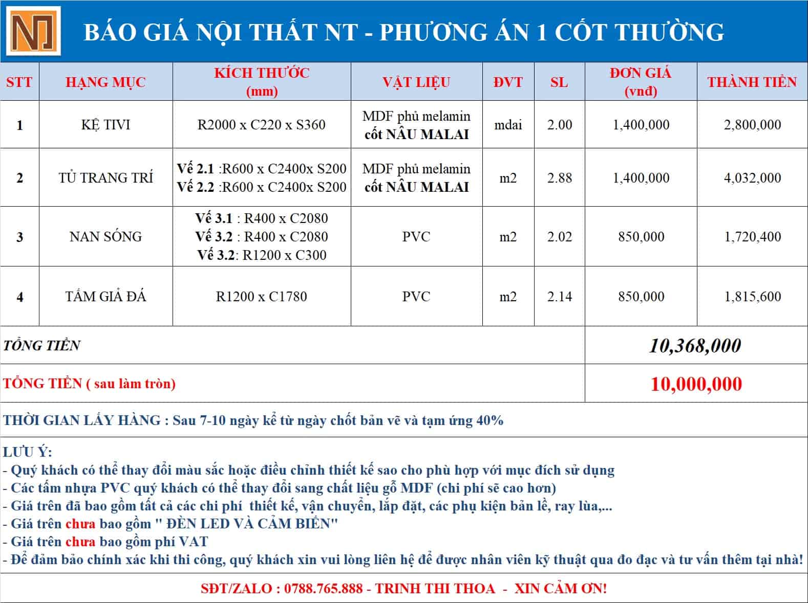 Sau khi thực hiện ốp vách kệ tivi xong, nhân viên Nội Thất NT tiến hành kiểm tra lại một lần nữa. Nếu không có sai xót gì, nhận thanh toán của khách hàng và tư vấn về chính sách bảo hành nếu khách hàng yêu cầu.