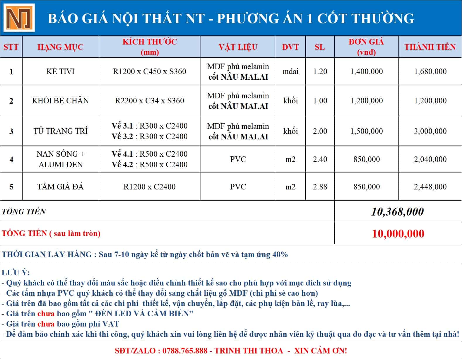 Sau khi thực hiện ốp vách kệ tivi xong, nhân viên Nội Thất NT tiến hành kiểm tra lại một lần nữa. Nếu không có sai xót gì, nhận thanh toán của khách hàng và tư vấn về chính sách bảo hành nếu khách hàng yêu cầu.